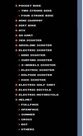scooters(3-wheels scooters, dolphin scooter, surfing scooter, kick scooters, mini scooter), Gasoline scooter, Sea Scooter, Dirt Bike, Pocket Bike, Mini Chopper, Gas skateboard, Electric Bicycle, Electric Motorcycle, Golf cart and other sports